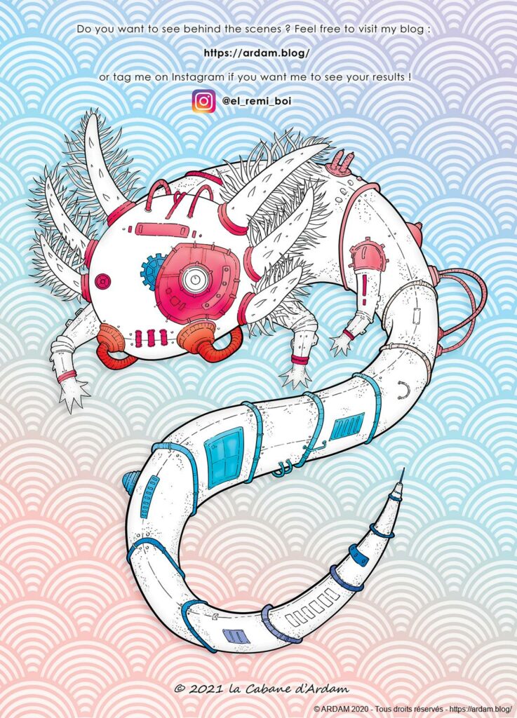 Un petit mot ceci dit, si vous comptez colorier au feutre ou au marqueur alcool, munissez vous d’une feuille de brouillon en sous-main, pour éviter les bavures sur la page d’après.