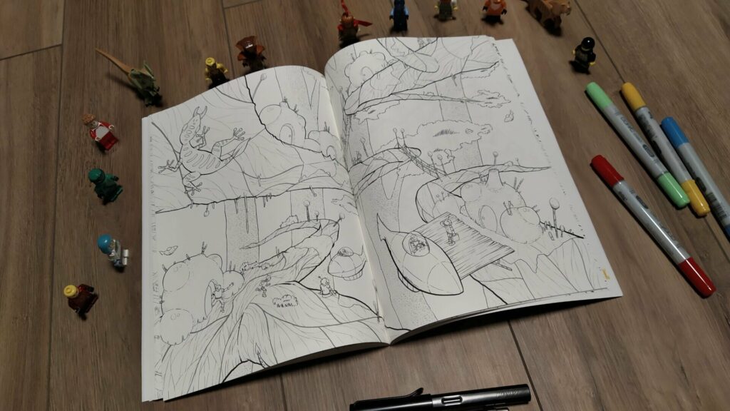 Le dernier point, qui me faisait un peu peur, je dois l’avouer, c’est la qualité du papier et de l’encre. Comme je voulais que le livre puisse être colorié au feutre, il fallait un papier résistant et de l’encre qui ne bave pas : eh bien c’est un succès ! J’ai fait un test en passant sur des zones bien noires au copic, rien ne bouge, ni l’encre ni le papier. Ouf !