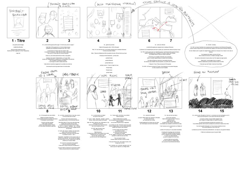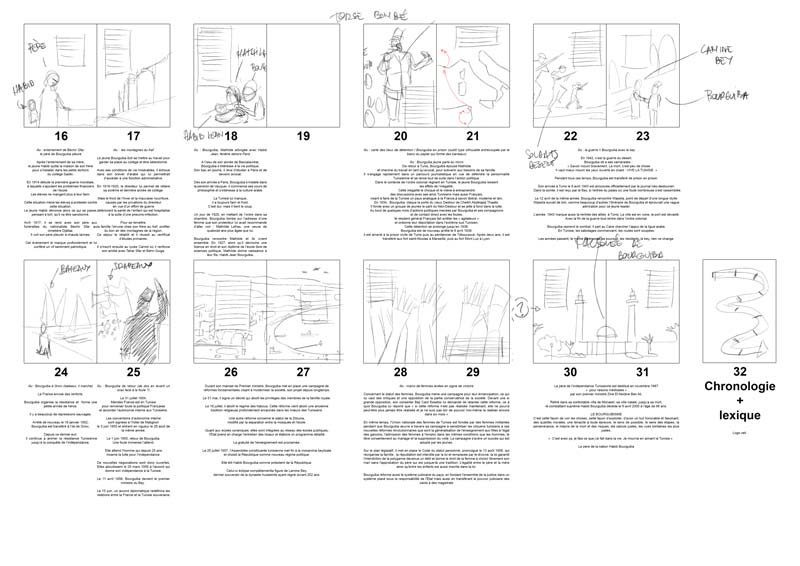 Pour commencer, je me suis penché sur le texte d’Ahlem et je l’ai découpé pour avoir des doubles pages cohérentes. On a du faire quelques allers-retours, car il y avait beaucoup de texte, et nous avions pour consigne de rester sous la barre des 30 pages. Finalement tout est rentré, et on a eu une première idée du format de l’ouvrage.