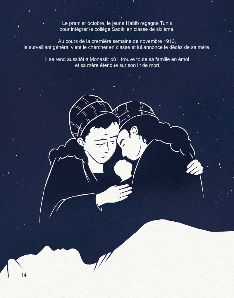 Ce projet a été pour moi l’occasion d’expérimenter pas mal de chose d’un point de vue graphique. Sur l’image ci-dessus par exemple, il fallait représenter le décès de la mère, et la famille en deuil : une scène marquante de la vie du jeune Habib. Il y a quelques années, j’aurais peut être représenté les choses de manière plus littérale, posé ma “caméra” dans un coin de la pièce et dessiné une scène complète. Mais je pense que le choc aurait été moins important.