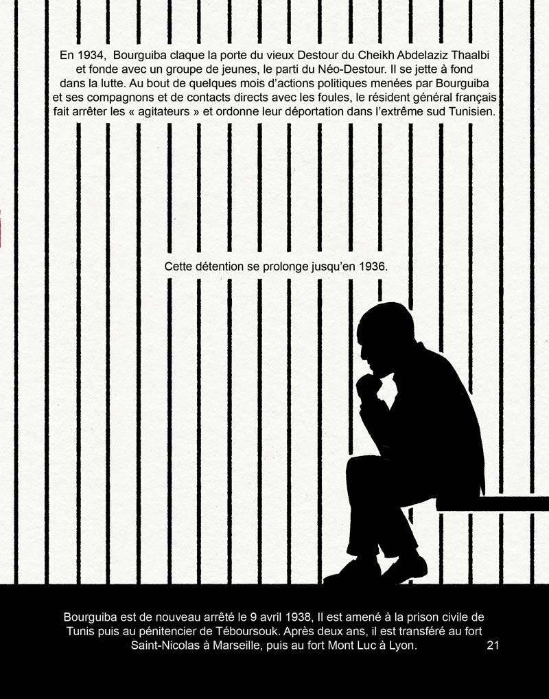 Un autre exemple est cette scène en prison. Là aussi j’ai volontairement épuré l’image pour augmenter le sentiment d’isolement et d’enfermement. Disséminées tout au long du livre, au milieu des autres illustrations plus classiques, ces planches m’ont permis de mettre l’accent sur des moments déterminants dans le parcours de Bourguiba.