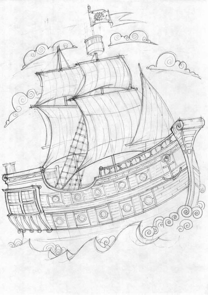Pour commencer j’ai accumulé les micro-erreurs au moment du crayonné : voiles trop petites par rapport à la coque, composition générale un peu bancale, problème de perspective sur l’arrière du bateau (qui devrait être plus fin), etc. Généralement je laisse l’image « reposer » un peu, afin de revenir dessus avec un œil neuf, avant d’entrer dans les détails. Malheureusement pour cette image, je n’ai pas suivi mes propres conseils : j’ai commencé à détailler direct après la mise en place, sans prendre le temps de la réflexion.