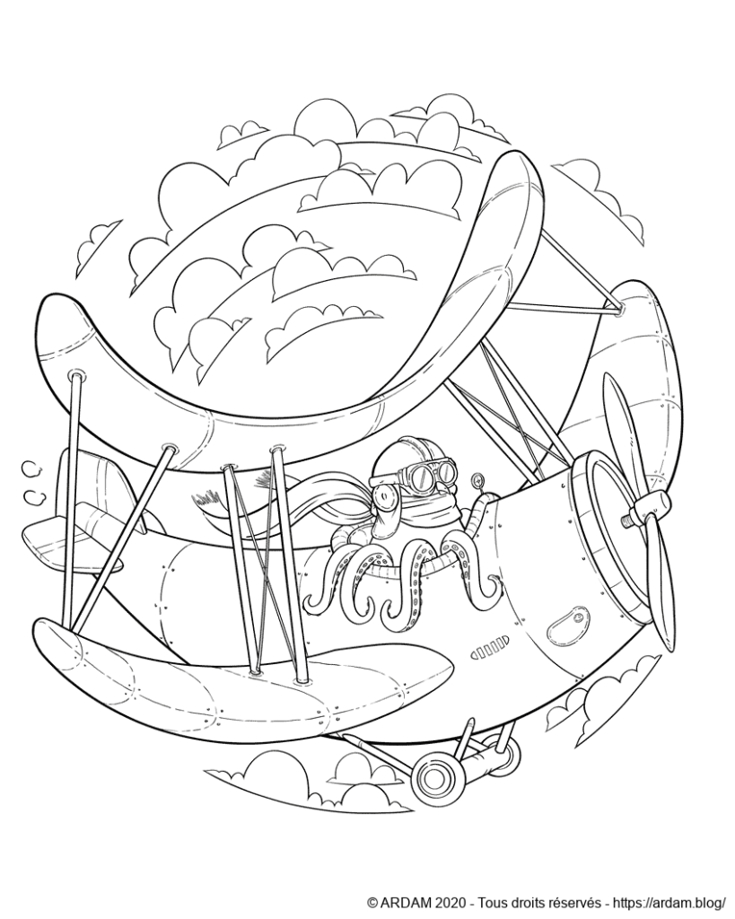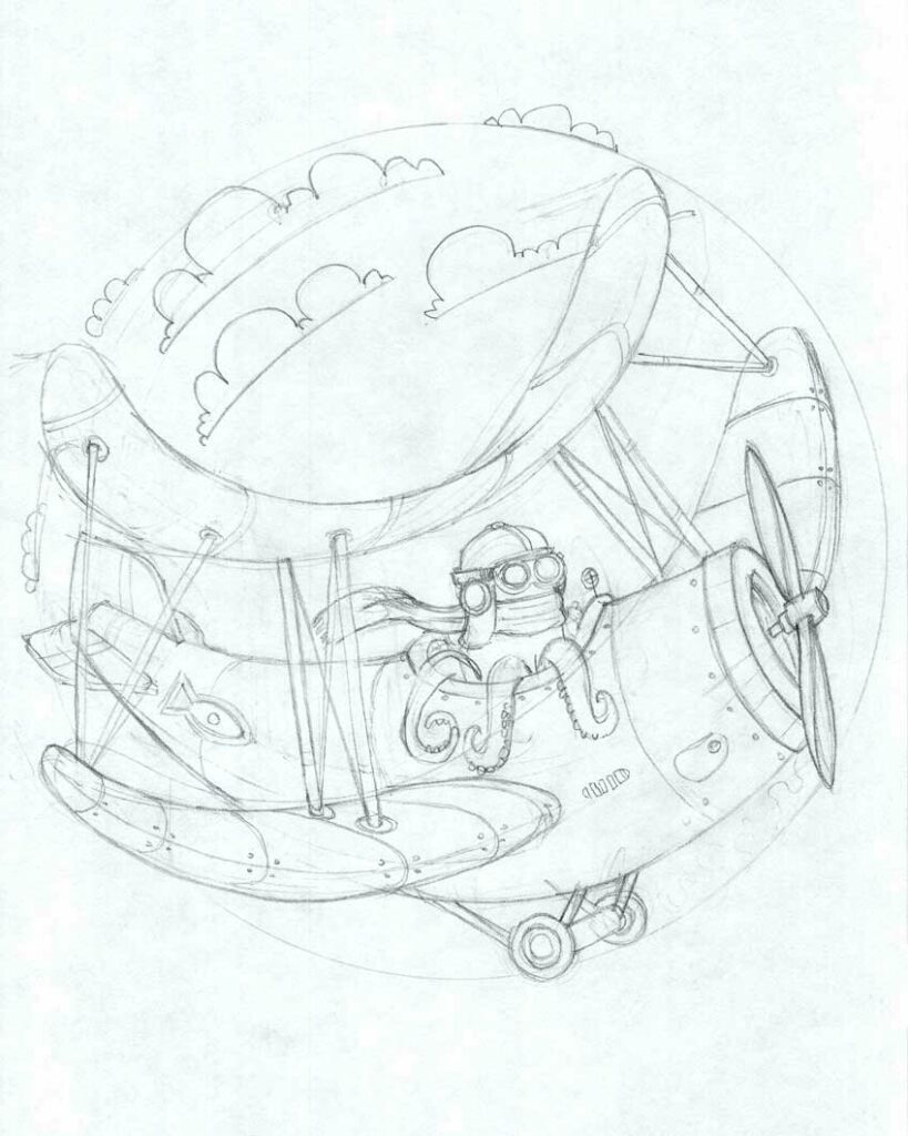 On décolle tout de suite avec un poulpe à hélice ! Pour cette planche, deux points de départ : d’abord ma chérie s’est mise à l’aviation, je vois donc souvent ses livres d’apprentissage remplis de schémas d’avion. Ensuite un ami m’a demandé récemment de dessiner des tentacules (pas de questions OK). J’ai mixé le tout et le tour était joué !