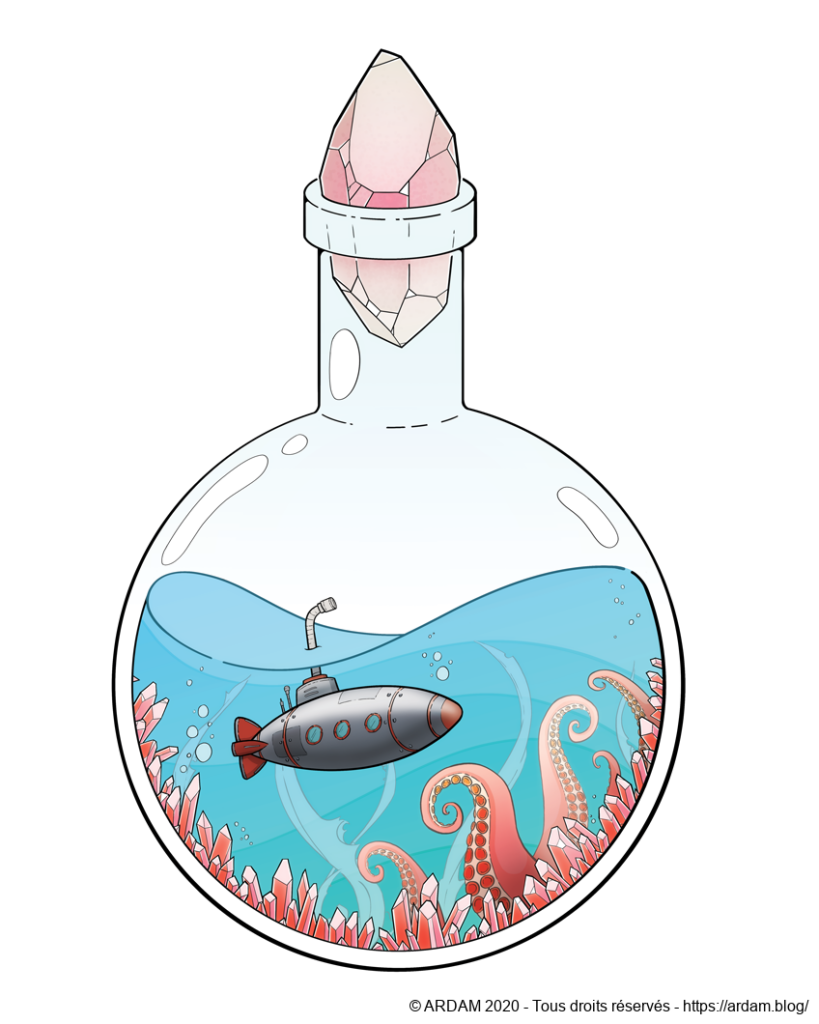 Cette dernière planche met en scène un sous-marin qui explore le fond d’une fiole de potion ! J’avais depuis longtemps dans mes cartons l’idée de faire un mini-diorama dans une bouteille ou dans un verre, mais je ne savais pas quoi exactement. J’ai même pensé un moment à des chevaliers sur des escargots (oui, j’étais parti loin…)