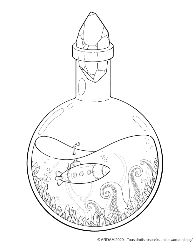 Finalement le sous-marin s’est imposé de lui-même lorsque j’ai dessiné la fiole. J’aime bien le mouvement de la surface de l’eau.